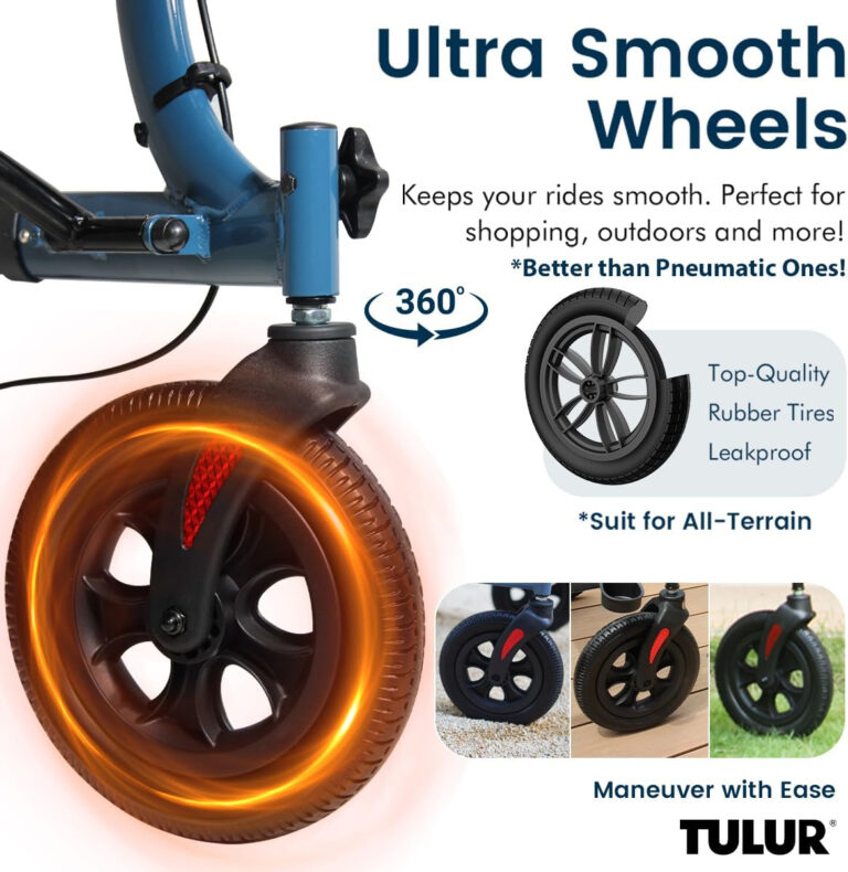 I bought this for my husband who is having a toe removed. His balance is going to be impaired for awhile, maybe forever. He needs something that will help him feel more stable and prevent falls without being too much trouble to deal with. This is the perfect solution. It folds easily so it’s very easy to put in the car. It’s very durable, but lighter than I expected so it’s easy for me to handle. The larger tires make it easier to maneuver compared to the small, fixed wheels that are usually on a walker. I really appreciate that the front wheels also rotate around 360degrees. It makes it glide better without a lot of strength. The brakes are on the handles giving him a lot more control. I also like that the seat part has a backrest. It gives him a little place to rest a bit and I could push him around in it if I really needed to.