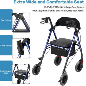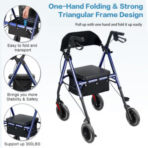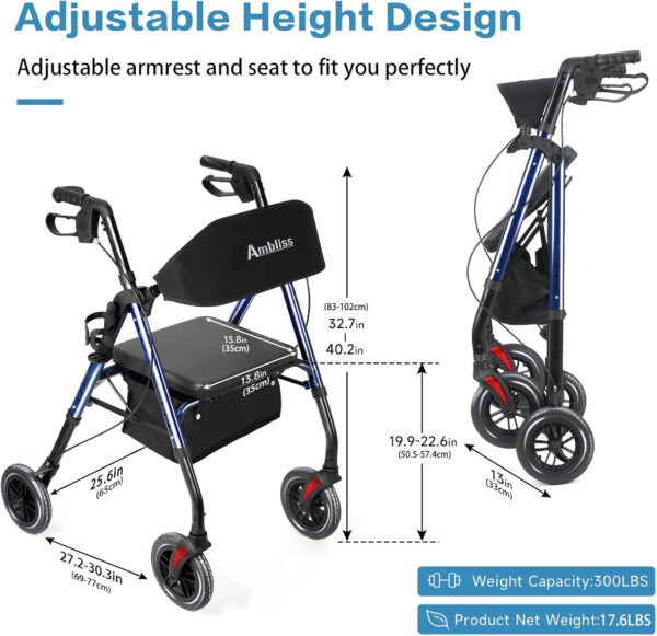 Amblisss Walkers for Seniors with Seat, Foldable Rollator Walkers, 300 lbs Weight Capacity, 8″ Wheels Dual Height Ajustable, Rolling Walker with Seat for All-Terrain, Dark Blue