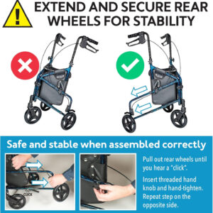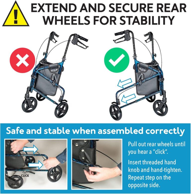 What a wonderful product to help someone who has some minor mobility issues! This allows the user to be mobile and control where they go without having to use a limited square walker with the ugly tennis balls on the feet. This is a solidly built assistive device, with all of the exact same features as much higher priced similar items, so it is budget friendly and a SOLID, attractive product. It’s very light to carry, easy to fold, and narrow enough to maneuver through most doorways without any problems. Absolute best value for the money. Out of the package ready to go in minutes once you adjust for height, extend the back legs and secure the brake cable to the frame (with the included clips). If you have someone that just needs that little extra stability while walking this is the way to go! Brakes are good, just have to learn to squeeze both sides at the same time or you’ll keep going to the opposite side of the handle you brake with. The brakes also lock, press handles down to lock, back up to unlock.