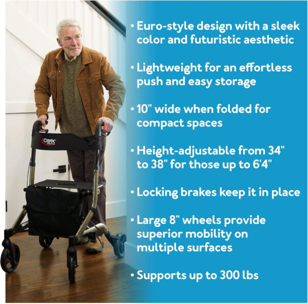 Carex Crosstour Rolling Walker Rollator – Rolling Walker with Seat – Folding, Euro Style Rollator, 4 Wheel Walker for Seniors- 300lb Capacity, Walker with Seat for Seniors