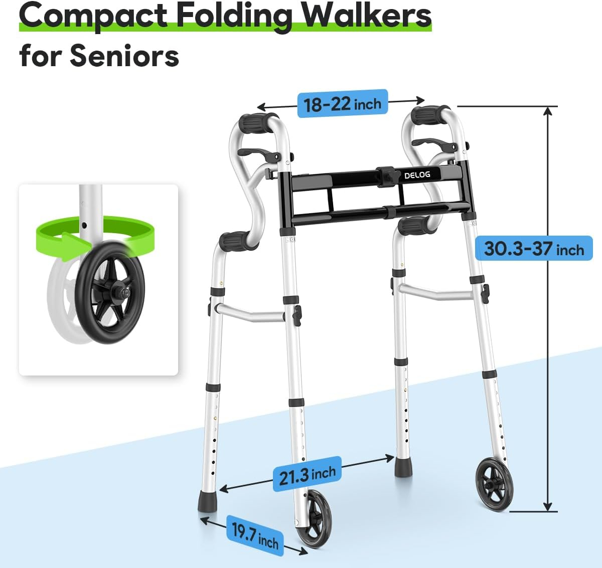 Delog Narrow Folding Walker for Seniors, 3 in 1 Folding Walker with 5” Front Wheels Width Adjustable Compact Standard Walker Support Up to 350lbs