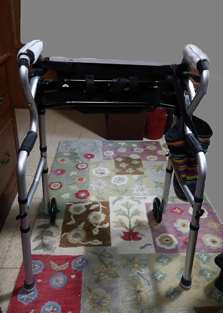 My 87 yr old Mom is 100 percent set against using a cane or walker. But she kinda needs one so, being the disobedient daughter that I am, I ordered this. It’s PERFECT and fits her small frame (now abt 5’4) and the doorways nicely. It’s sturdy but lightweight. She uses it a little but she is also walking better without it (bcuz she doesn’t want it). So it’s a win win for me. Really it does provide her with a bit of security when she’s feeling phobic about the possibility of falling. It was easy to put together. It’s easy to fold and it just doesn’t take up a lot of space.