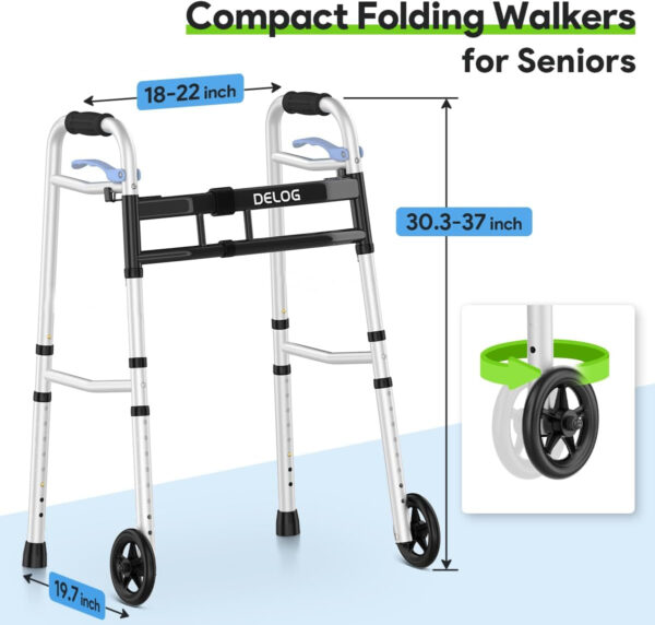 Great setup! It was narrow enough to get through doors. I was able to adjust the height short enough it was comfortable for me, as I am maybe 4’9″ on a good day. So easy to fold and put in the car with a squeeze of the handles. Easy to push and maneuver, it will make you feel safe. This is one of the best for the price.