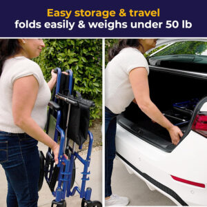 This has been the best purchase for us. It is sturdy but not as heavy as other wheelchairs. It folds up like a breeze with minimal effort. I put the foot holders on today and it literally took me 5 minutes. We decided to buy one because we felt it would be easier than having to run into a doctors office first to ask if you could borrow their wheelchair for the appointment and risk it not being available or too small. My husband is 6 feet 5 inches tall. This wheelchair fits him comfortably and I don’t have to bend forward to push it. Best of all it fits inside our vehicle behind my front seat and it is easy to get it in and out. And the price is right on top of all that!!