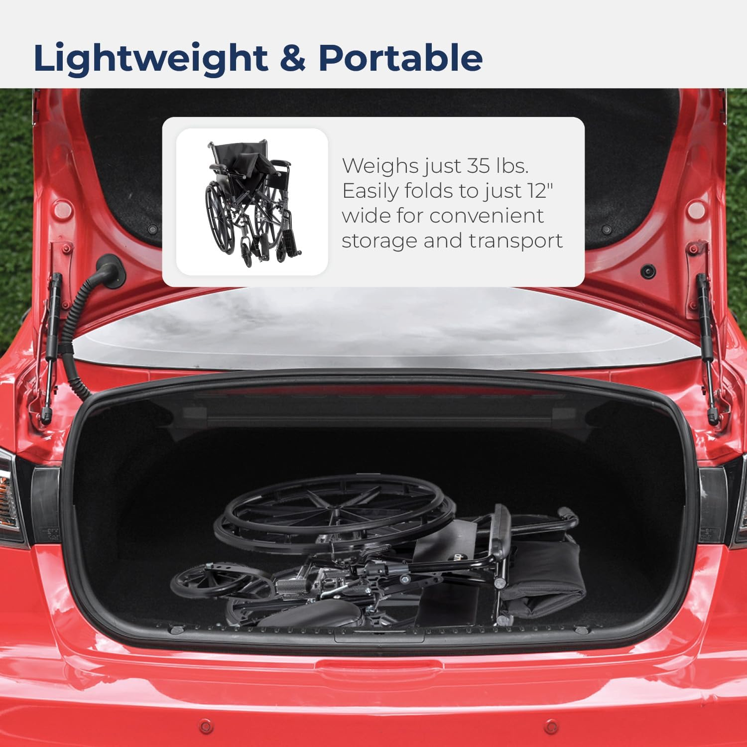 My wife has lung cancer and COPD. She can walk but requires oxygen and walking anywhere makes her completely winded. This wheelchair is fantastic. We have had it for a couple of months now and for the frequent doctor’s appointments it has made both of our lives so much better. It is light and easy to wheel her around yet is made very well. I have a small SUV and it collapses easily and fits into the back with no problem at all. It is not too heavy to lift in either. My wife is only 5’4″ and weighs about 120 lbs. but the 16″ wide chair is perfectly comfortable for her and it fits through doorways without any problem at all. In fact, I sat in it and it is very comfortable for me (and I am 6′ tall and weigh about 225 lbs.)It maneuvers well when there is not a lot of room and when I take her out, she has to have oxygen so I have to coordinate her and the carriage for the oxygen. This wheelchair allows me to coordinate both with no problem. It came basically assembled and is very easy to open and fold down for putting in the car. The feet rests are easily detachable and adjust very easily.The best thing was the price. I wasn’t sure that for this reasonable price, it would be made that well or stand up to extended usage but so far it is perfect. I could have spent a lot more on another wheelchair with a few more fancy features, but for something that really works well and is reasonably priced, I am extremely happy with our purchase and how well it works for us.