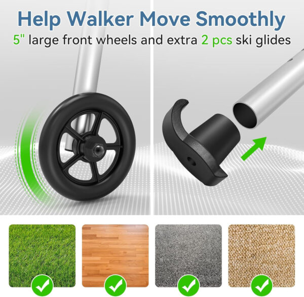 Recent fracture required a walker, this did not disappoint. Easy to assemble, folds easily and is lightweight but sturdy.The skis work great on floors and carpets.