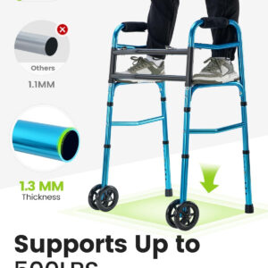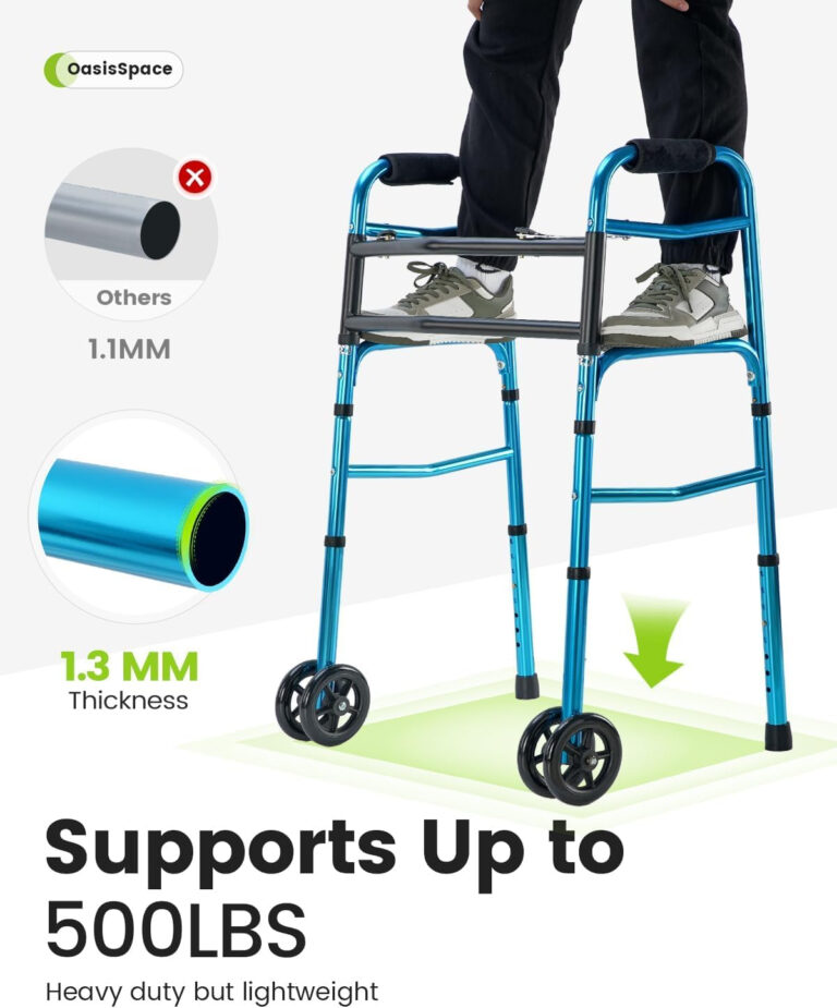 I’m a big guy. 6ft 425 lb and I broke my tib, fib and shattered my ankle. I bought this walker to help me get around after I got out of the rehab hospital. I really like the bright blue finish in the metal. I also really love the comfortable grips that come extra. I have been using this walker for the better part of 3 months now and I fully trust it to not fail or break. The only thing is it topples over easily when not in use if I bump into it but it’s easy to set back up because it’s not very heavy. This also makes it easier to maneuver in tight spaces or where there are turns to be made. I would definitely recommend this to people that are over 300 lbs and up to 500lbs.