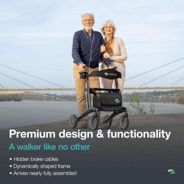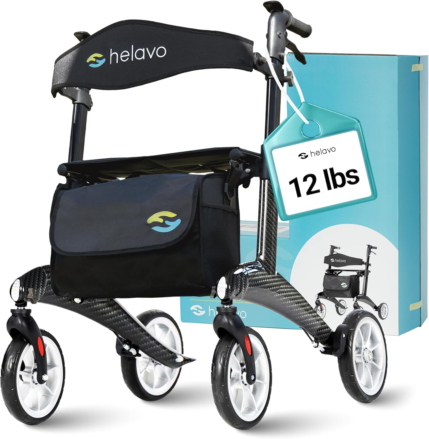 I already own a Helavo folding rollator, and very satisfied with that model for travel (as it double folds into a compact configuration, ideal for airline checked baggage). But for everyday use, the new carbon fiber Helavo rollator is terrific — light weight, easy to load in the trunk of my car, ok to carry up/down stairs if necessary. The unit is delivered well-packaged and only minor assembly is required. I didn’t even need instructions; but there is a short video one can look at. (For those not mechanically inclined at all, best to get a friend or relative to help.) My only critical comment is that this new model is not yet listed (as of 5/16/24) on the Helavo extended warranty registration page. So you may need to send an e-mail to customer support to register your purchase for the 3-year extended warranty. [Note: I am 5’6″ and the handles are raised to the max. position; so very tall people might want to check to see if this model is appropriate for them. I also have an Alevo Country Rollator that might adjust better for tall persons — Alevo makes a light carbon fiber model. I am heavy-set and the Helavo rollators are fine dimension-wise for seat width and depth — very comfortable to sit in, even for extended periods of time.]Update: 6/2/24 – I’ve been using the rollator for several weeks now and it is proving to be a very good companion. Excellent stability and comfortable to sit in. I walk a mile circuit in the local park regularly and can do so at a pace nearly comparable to what I could do when I was younger and did not need the rollator.