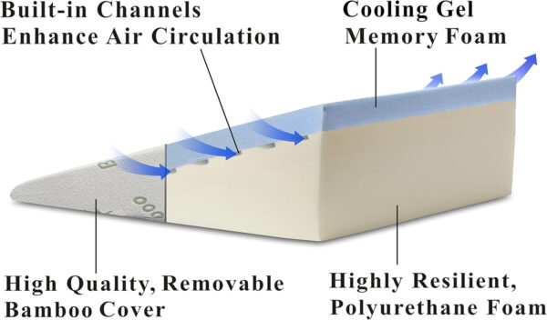 I received this pillow a few days ago. I purchased this pillow as a replacement for my current wedge pillow, which I use to help relieve my acid reflux.This is a large wedge pillow. It is much larger than my current wedge pillow, not just in length and width but also in thickness. I include a photo of both of my pillows for comparison. I didn’t realize that the pointy end of the pillow would be as thick as it is… about 2″ compared to my current pillow which comes more to a point. You can see the difference in my other photo showing them side by side. This is presenting a problem for me because of my back issues. I mention this not as a criticism of the pillow itself, but more for other people who have back issues and may benefit from knowing about this. I have had some muscle cramping after just 10 minutes lying on it, so I’m taking my time getting used to it, gradually increasing the amount of time I spend with it.I am hoping my back will adjust over time and I’ll finally be able to sleep a whole night with it because it really is a nice pillow. My current wedge pillow doesn’t have the memory foam like this one does, which really adds a layer of softness and comfort. I also like the extra width and length, allowing more of my body to be elevated. And I love the removable pillow cover. It is textured and seems to grip my night clothes better. It feels like it will make me less resistant to sliding down during the night, although I can’t be sure until I am actually able to sleep on it all night through. If I could change one thing, though, I would make the pointy end less thick so that it wouldn’t feel like such a gap under my lower back where the pillow ends. For that reason I gave it only 4 stars.The pillow arrived in a box much smaller than you’d think. That’s because it is shrink-wrapped. Once you cut open the plastic that surrounds the pillow, the air begins to enter the pillow to re-inflate it. The instructions that come with the pillow mention a slight odor, which will dissipate in a couple days. My pillow had that odor, but it was faint. I set the pillow in another room for 24 – 48 hrs, by which time the odor was gone.Right now I’m still sleeping on my old pillow, and just using my new pillow while watching tv in bed. Eventually I hope my back will get used to the thickness and I’ll be able to sleep on it the whole night through.**4/20/2017 UPDATE** I have now been sleeping on this pillow for 10 days or so. My back has adjusted to it’s shape. The pillow is very comfortable. I still slide down at night, but not as much as with the old pillow. I think the higher tip and the material help keep me in place. I find that I have to sleep with my head higher up towards the thick end so that the small of my back rests on the narrower end, creating less of a gap, or drop-off, under my back where the pillow ends.I have yet to learn how well the memory foam holds up over time. I’ve never had memory foam before and have always wondered if it will create permanent depressions and lose it’s support quickly. Only time will tell.