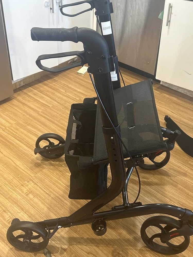 This rollator is light weight. Easy assembly. Good size for an average person. Really like the style & color as I like things that are a bit different. Seat is good & sturdy. Folds up super easy for transporting. Underseat compartment comes off a bit too easily but is a good size for those items you can’t carry. Seat holds a shopping basket. There is a cane holder, but no cup holder. I ordered a cup/phone holder which works very well.