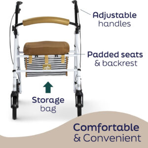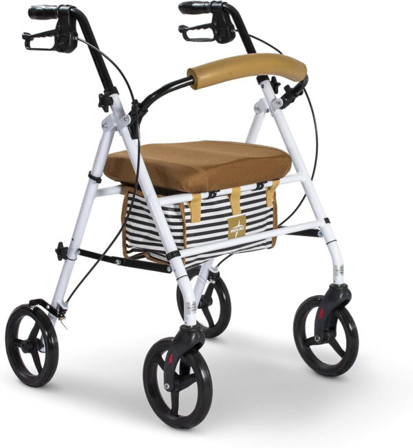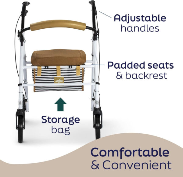 Medline Foldable Steel Rollator with Microban* Protection, 8″ Wheels, Comfortable Seat, 300 lbs, Weight Capacity, White