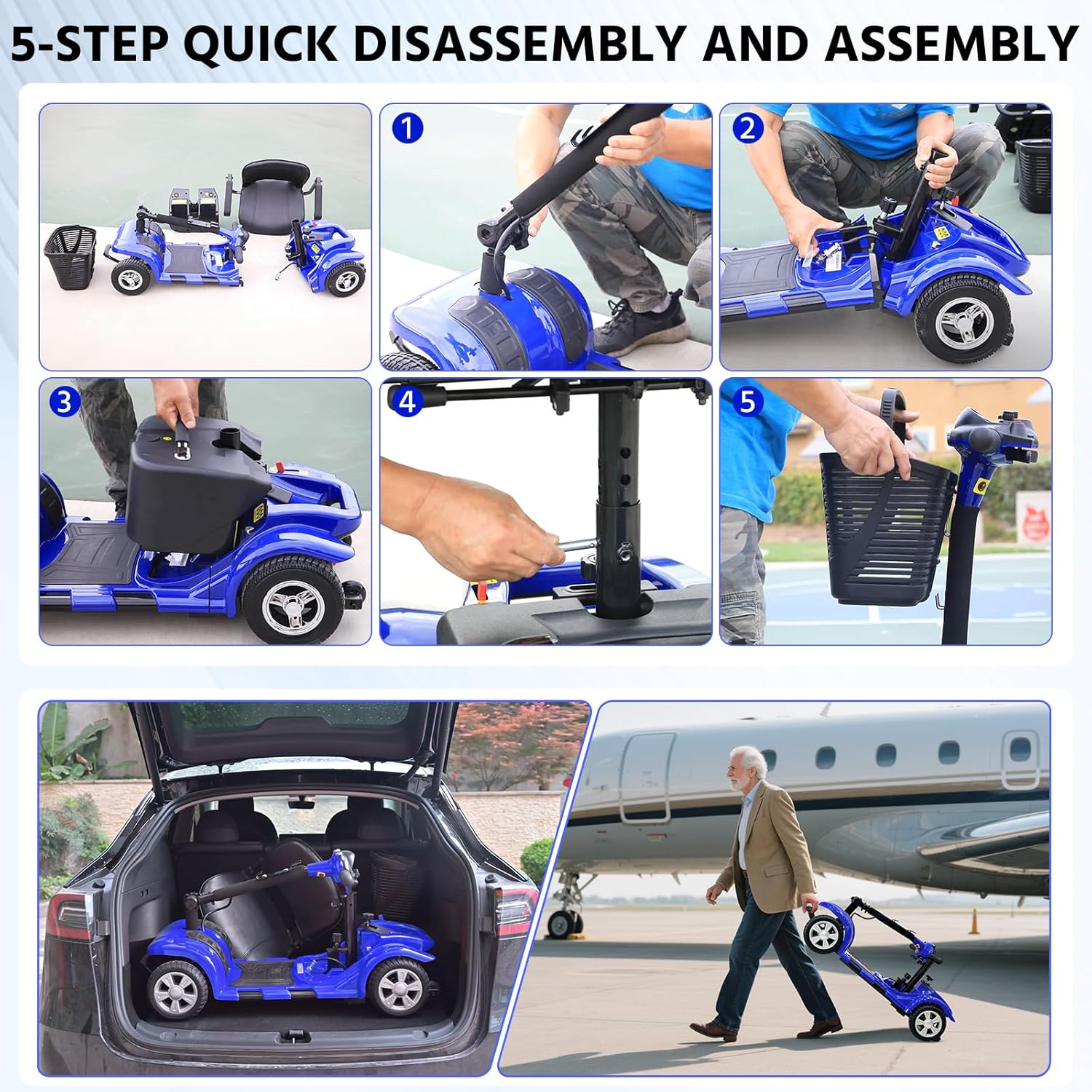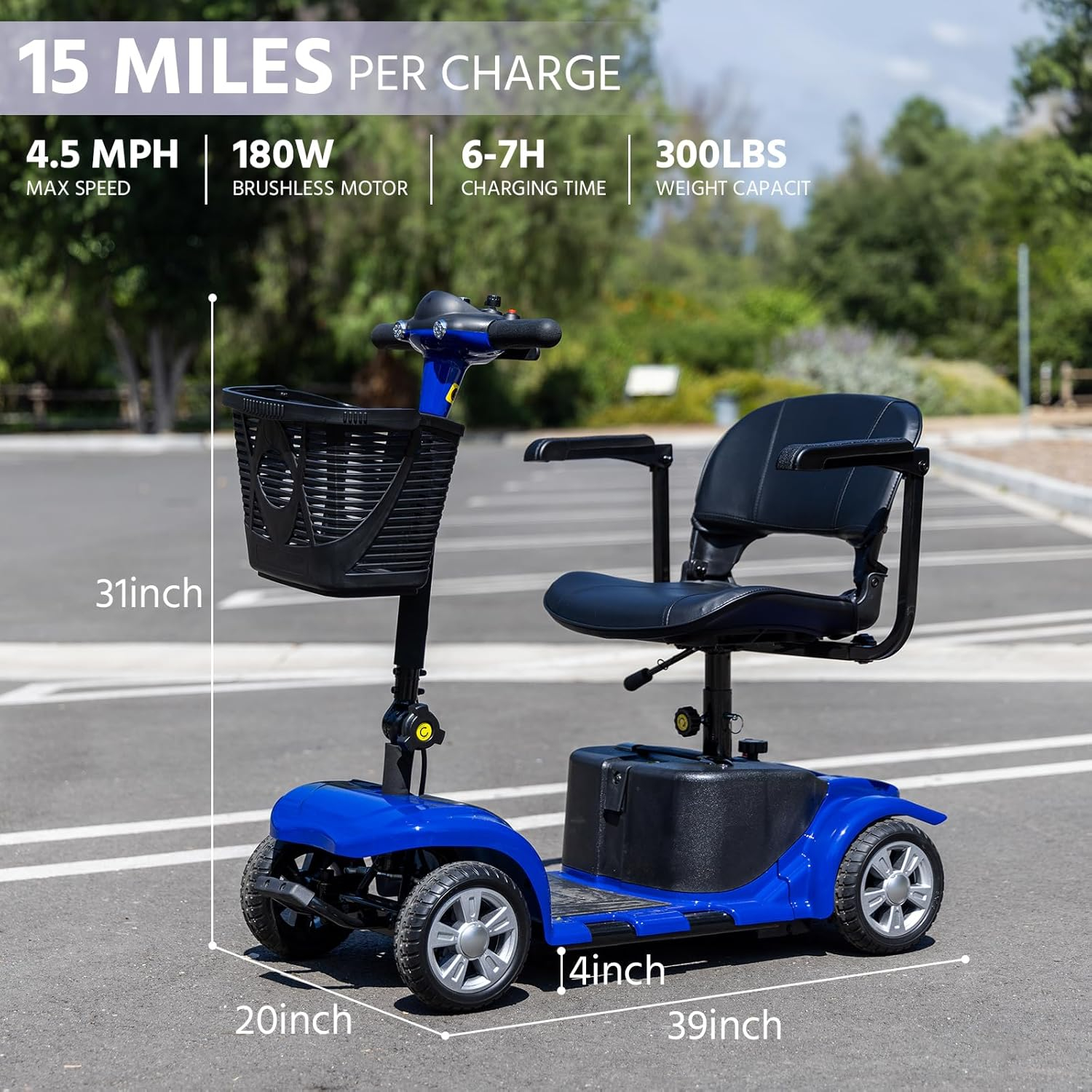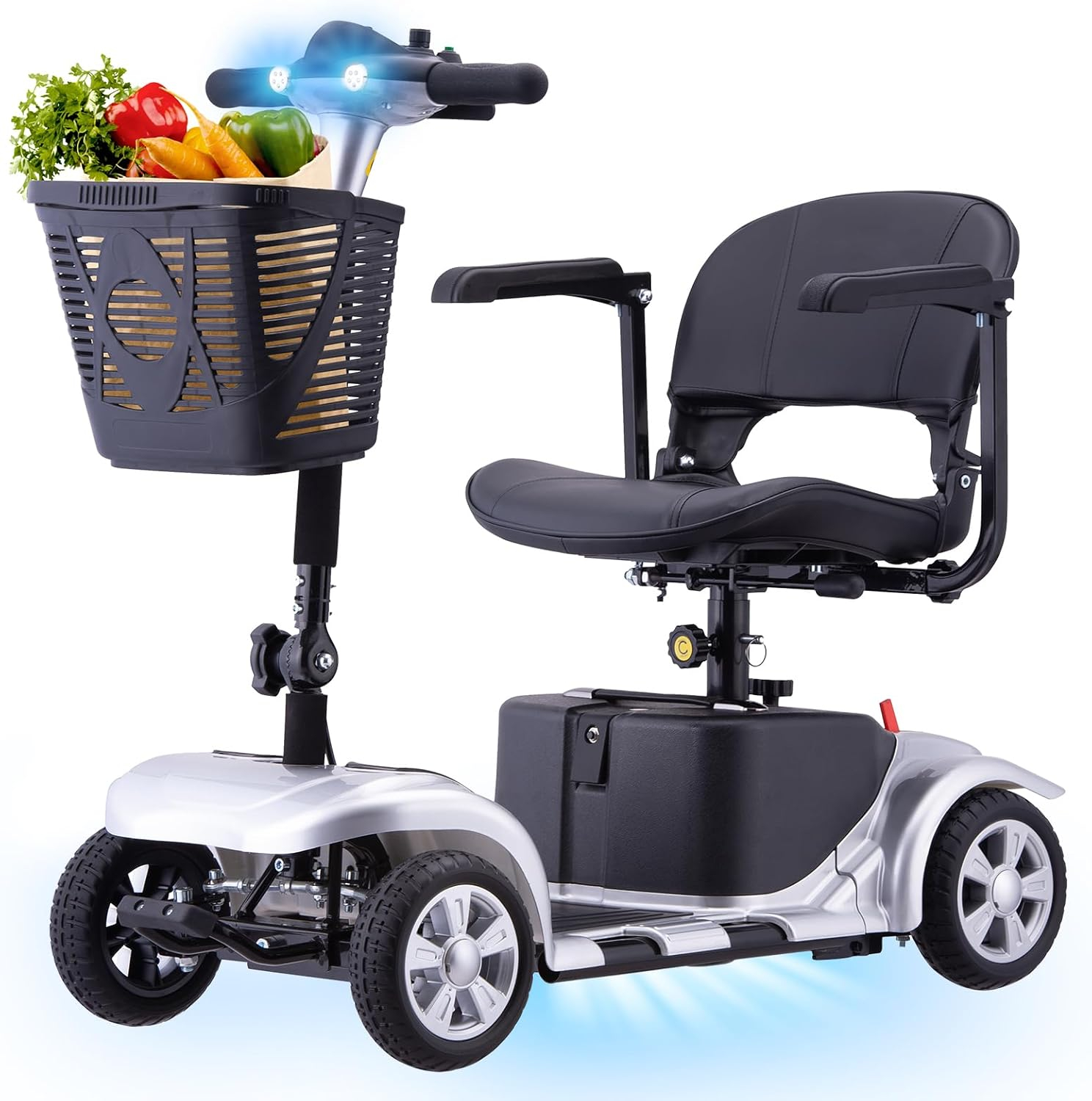 Mobility Scooter for Seniors, Adults, 4 Wheels Removable Electric Powered Chargeable Device, Foldable and Portable, with LED Headlights and Basket, Charger Include (Silver/Black)
