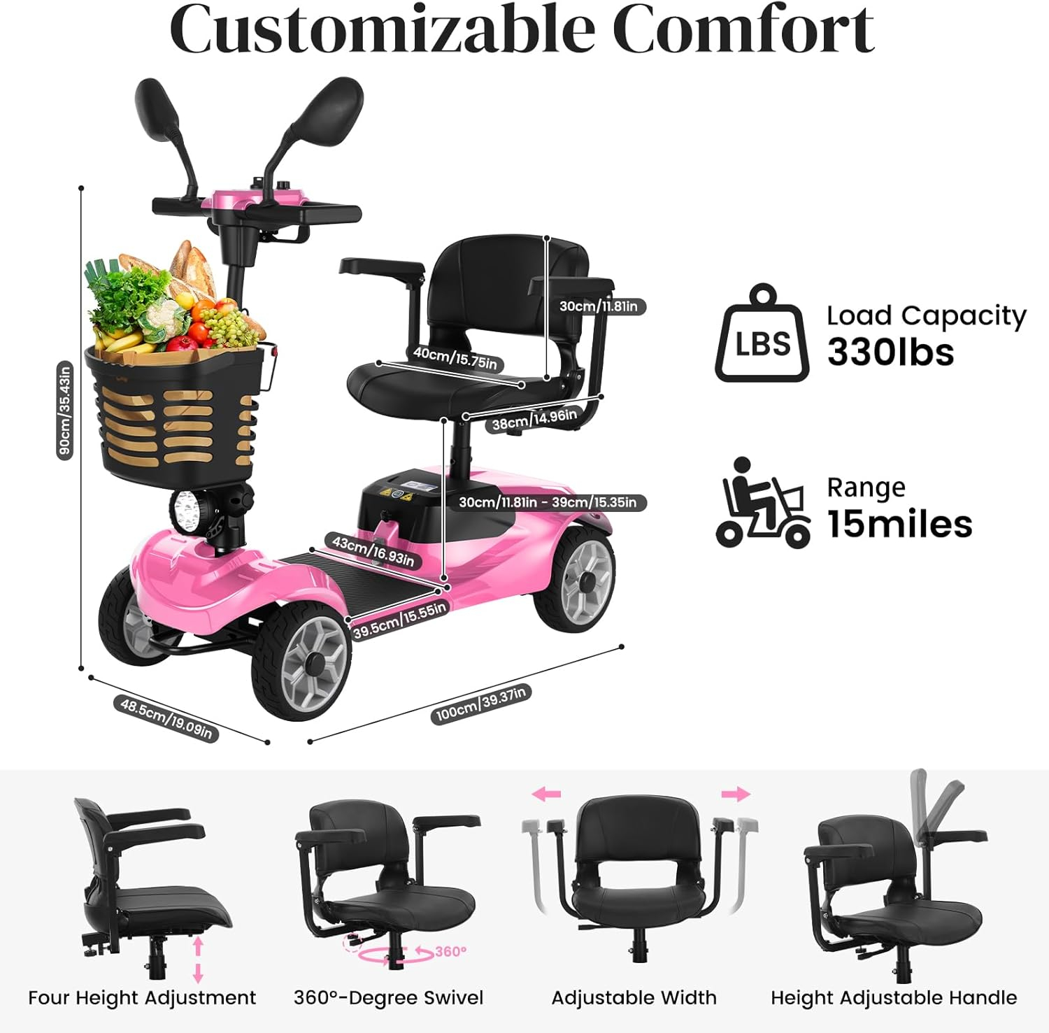 MS08 4-Wheel Mobility Scooter for Adults/Seniors, 15 Miles Range, 350W Motor, 360WH Battery, 330LBS Capacity, Rotating Seat, Cup Holder, Compact & Portable for Elderly