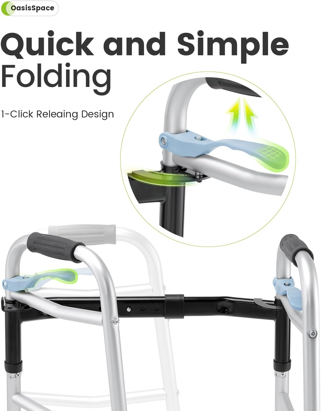 OasisSpace Compact Folding Walkers, Lightweight Walkers for Seniors Adults Elderly, Rolling Front Wheels Walker, Standard Walking Assist Narrow Walker for Small Spaces Up to 300lbs