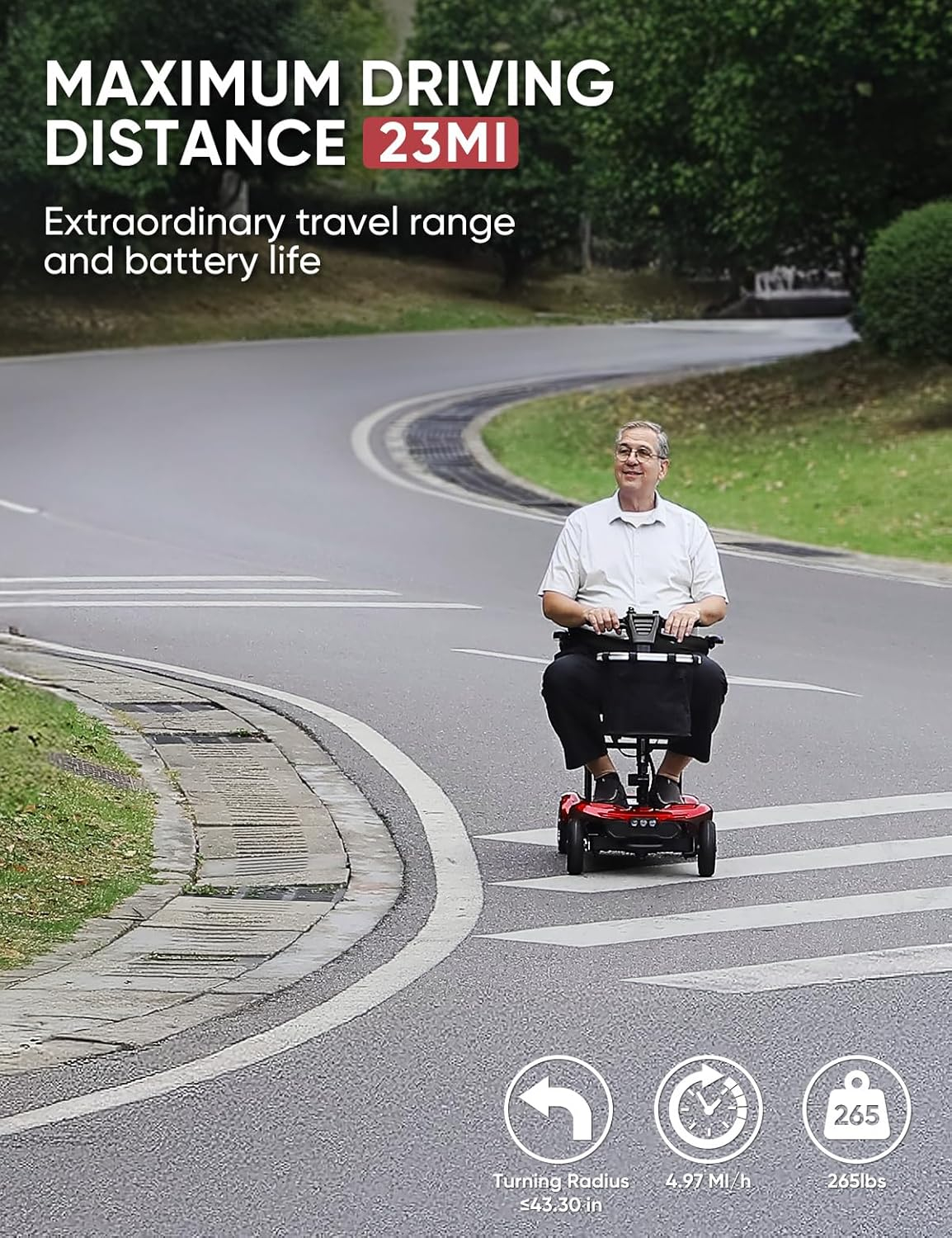 Powered Mobility Scooter for Adults, Seniors – 23MI Extra Long Range Foldable 4 Wheel Electric Motorized Scooter for Travels with Airport Approved Dual Batteries, All Terrain Motorized Scooter (Red)