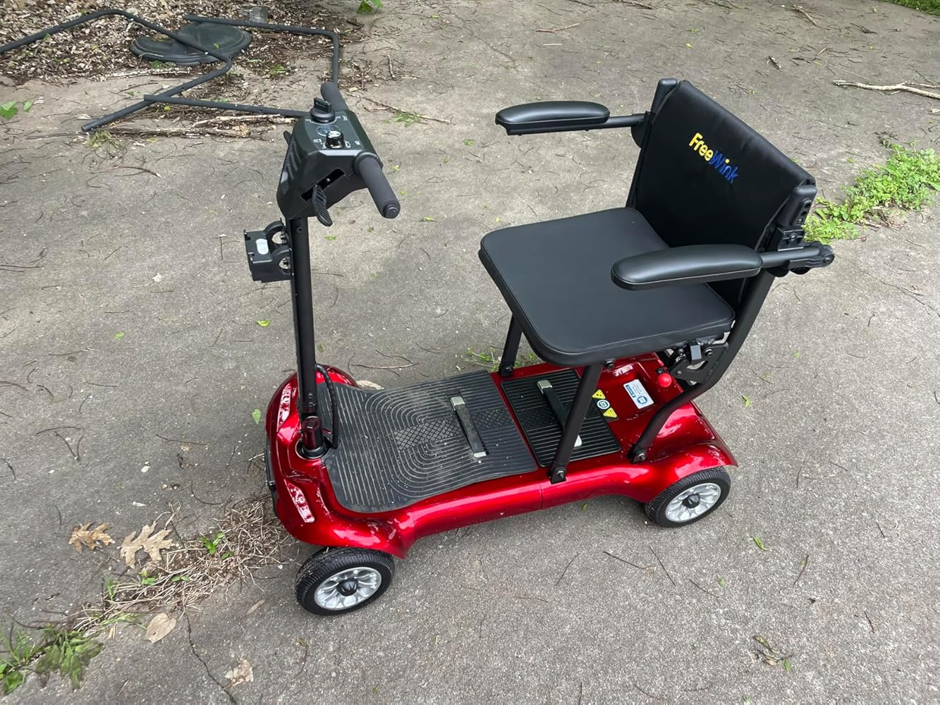 What a GREAT little scooter!! I’m in love with it:)…It runs very smoothly and I can hear the low murmur of the battery at its best! It was pretty simple to put together, although we noticed right away that two screws and nuts to attach one of the arms were missing. I contacted the Seller by email and received their reply within 24 hrs., as promised. They have sent a new pair of arm rest (although I only need the screws and nuts!). Anyway, the scooter is now ready for my next adventure. It does run at a fair speed and I was quite pleased with it, as well as the ease of folding it up and pivoting the back wheels into my car…a simple and fast loading! Much easier than the break apart in 5 pieces of my previous one. I have added a cell phone holder to the left handle as I always use my cell for directions, and it’s a great help. The Seller has responded promptly, within the promised 24 hrs., to all my questions and requests for information. I’m extremely pleased! Let’s hope it last…can’t tell about it yet, as I have just received it. I do recommend wholeheartedly!UPDATE: I recently took a 2 week vacation, scooter along. Per airline regulations, was only able to have ONE battery on the scooter to take with me on the plane with my carry-on. It performed beautifully. All drivers (taxi, Uber) were impressed with the low weight of it, remarking that they all – to a one! – found it much lighter than any others handled in the past. That was my main concern with the previous scooter I had. It makes my traveling possible and super-easy!:)