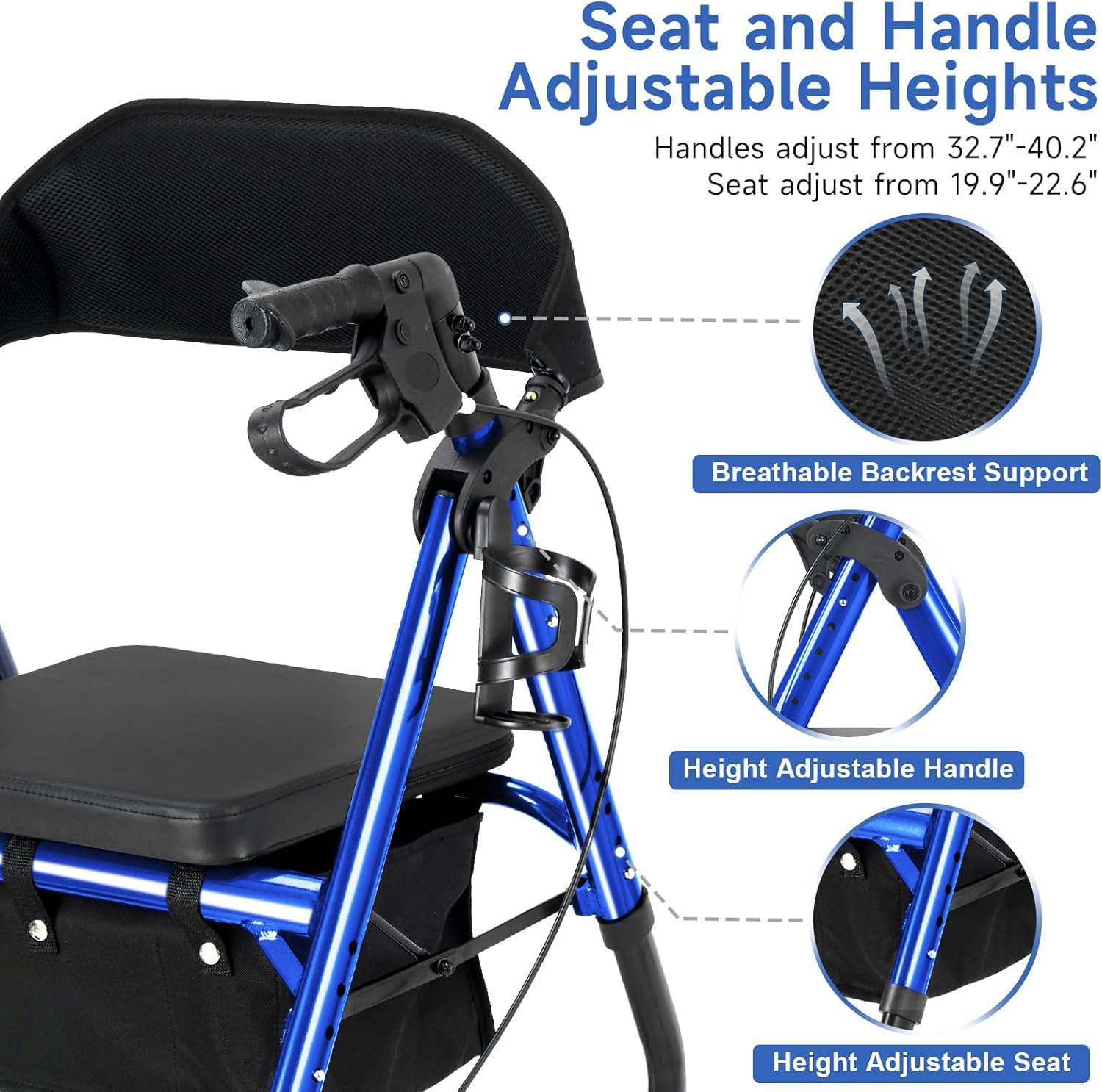 Rollator Walker with Seat and Brakes, 300 lbs Adults Bariatric Walker for Seniors with Extra Wide Backrest, Lightweight Folding Adjustable Height, All Terrain Rolling Walker 8 Inch 4 Wheels
