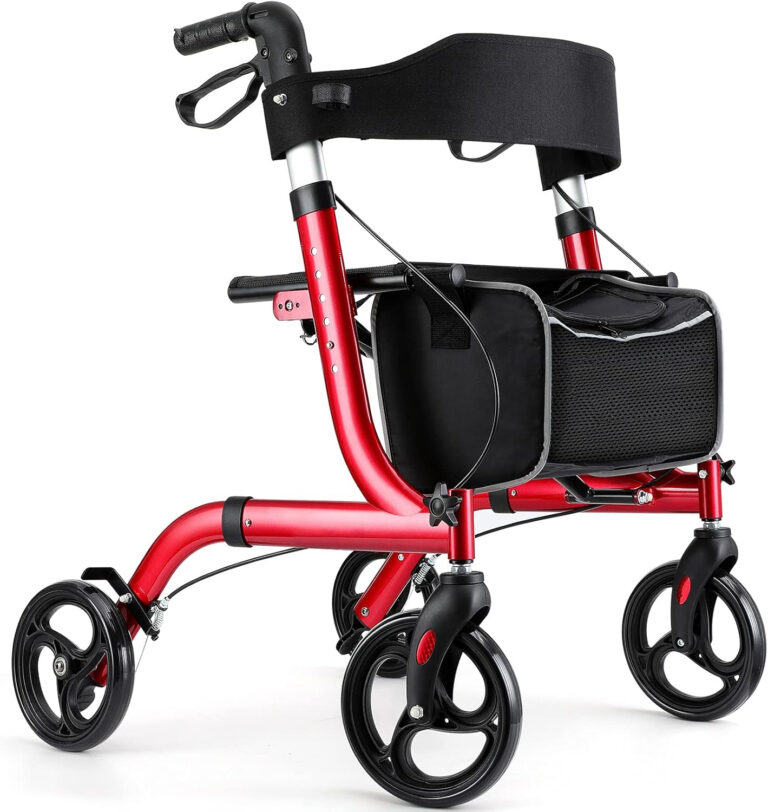Rollator Walkers for Seniors-Folding Rollator Walker with Seat and Four 8-inch Wheels-Medical Rollator Walker with Comfort Handles and Thick Backrest-Lightweight Aluminium Frame Red