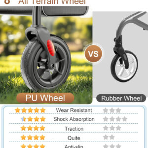 Light weight yet very well made with deep pocket.. Glides and easy to manuever. Made for all terrains. Good Looking.Height adjustment.