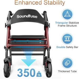 I’ve been using a cane for a number of years now, but my back is so bad that I’m afraid to go anywhere because I can’t stand for more than a couple minutes. Even going to the doctors I’m afraid I won’t make it from the parking lot to the building, then to the office. I decided it was time to get a walker with a seat. I did my homework because I wanted to make sure the one I bought would be worth the money. The Soundfuse Rollator was a great buy. It’s easy to maneuver, and you can make really tight turns. The seat is roomy and comfortable. The wheels go over bumps easily. The storage bag under the seat is very handy. The best part is how it feels. It doesn’t feel cheap at all. Some walkers feel like it would bend just going over some bumps. This one feels very sturdy. I can’t see anything making it bend. I feel very secure when using this walker. And it’s so easy to open and close. To close you just pull up on a strap it has under the seat and it’s closed. The brakes work very well also. I’m so happy with my purchase I’m sure you will be too.