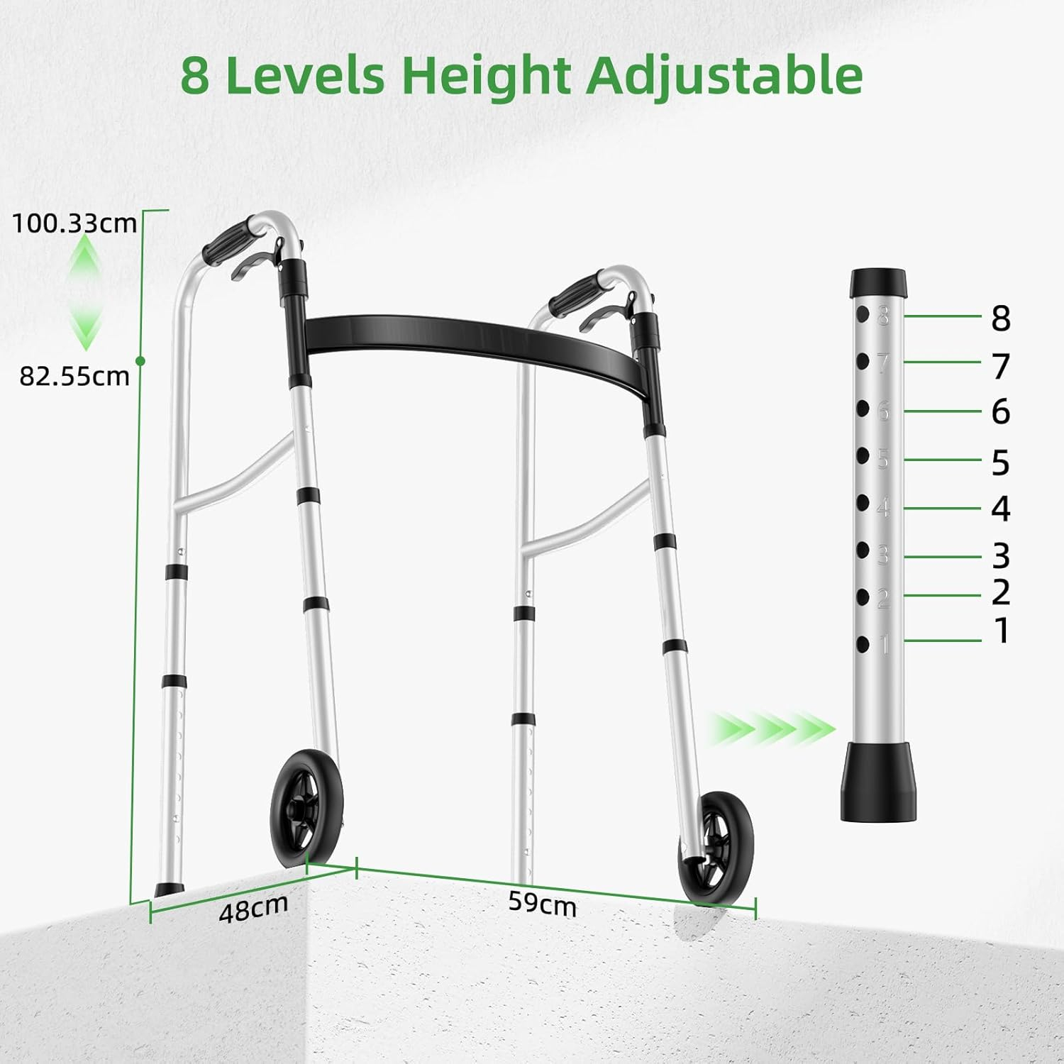 Standard Walkers for Seniors – 8 Levels Adjustable Height Folding Walker with Wheels, Lightweight Front Wheel Walkers for Elders & Adults & Handicapped, Weighing Up to 350 Pounds Rolling Walker