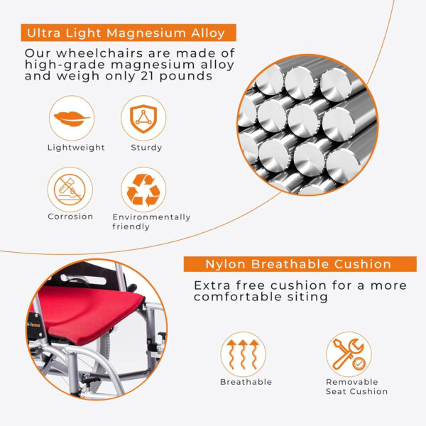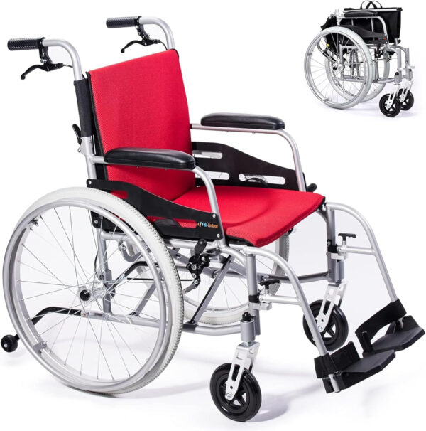 SUMELL Magnesium Lightweight Wheelchair – FSA HSA Eligible 21lbs Self propelled Chair with Travel Bag and Cushion, Portable and Folding 17.5” W Seat, Park & Brake Anti Tipper, Ultra Light, Red
