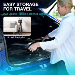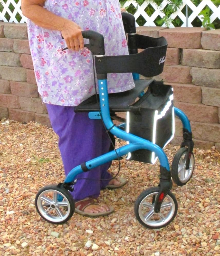 I really love this and I am so glad that I got it. It is a great help for me with my walking in the house or outside. Even in my yard full of stones. Rolls easily. Great quality and stylish design. I like that the front carry bag can be easily removed as needed. It does fold up easily to put in the trunk. Take the front bag off, pull up on the strap across the top of the seat and it folds up easily. Lightweight. then push the seat down and it pops back to full size. I searched for one with a wide seat, as most of them are very small. This seat is Very comfortable and gives me room on each side. The seat is very comfortable to sit on when you are out and about. The padded backrest is SO much better than most offered. Great price for all that you get with this one!!!! And, my huge dog can’t even knock me over.