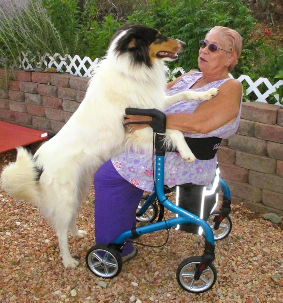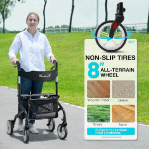 Great walker – just what we wanted. Easy to assembe. Light weight and easy to put in SUV. Took to our mall and it was easy to manuever and walk through stores. Like that it folds and can lock in folded position. Does not fall over and can be rolled in that position. Overall very good product. My wife is hot tall and not heavy so it is a great solution for her. It is sturdy and would handle a larger person fine.
