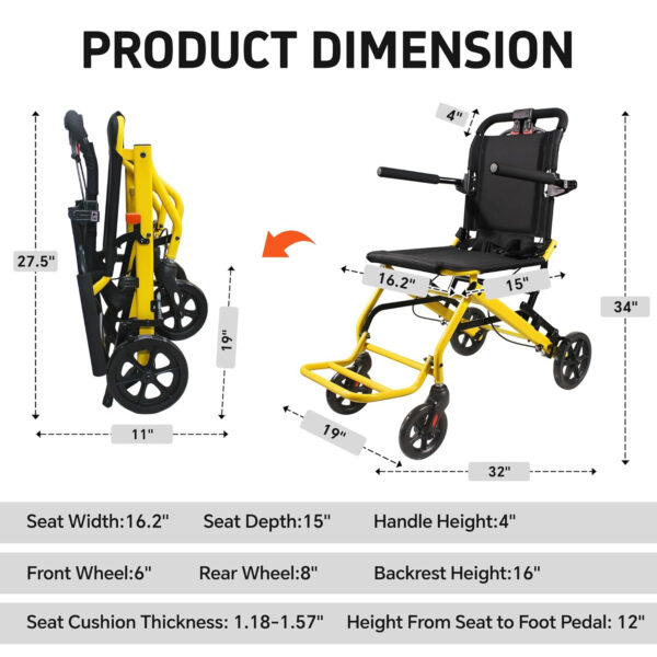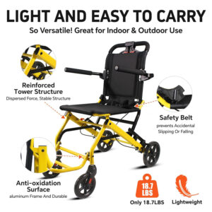 Ultra-Light 18lbs Portable Wheelchair for Seniors & Adults – 220lbs Max Weight, 16.2″ Comfy Seat – Travel & Daily Home Use (Yellow)