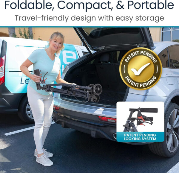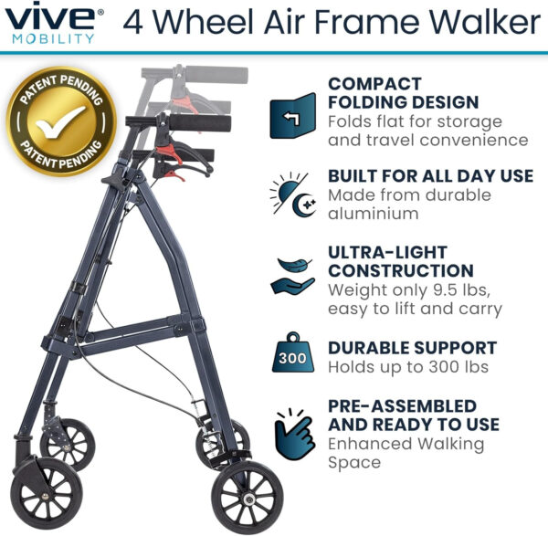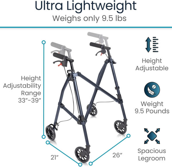 This walker is lightweight, easy to fold and perfect to stabilize anyone with difficulty walking. It arrives already assembled and is easy to fold. The brakes work well and the six inch wheels travel easily over pavement.I am 5’2″ and it is a tiny bit tall for me at the lowest setting but I don’t plan to walk long distances.