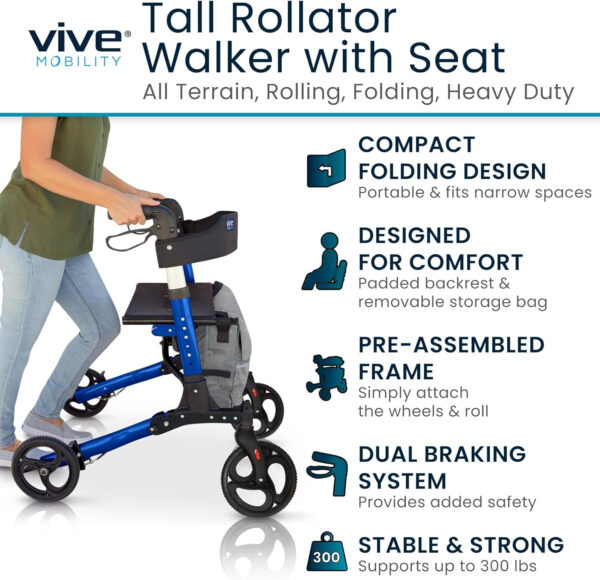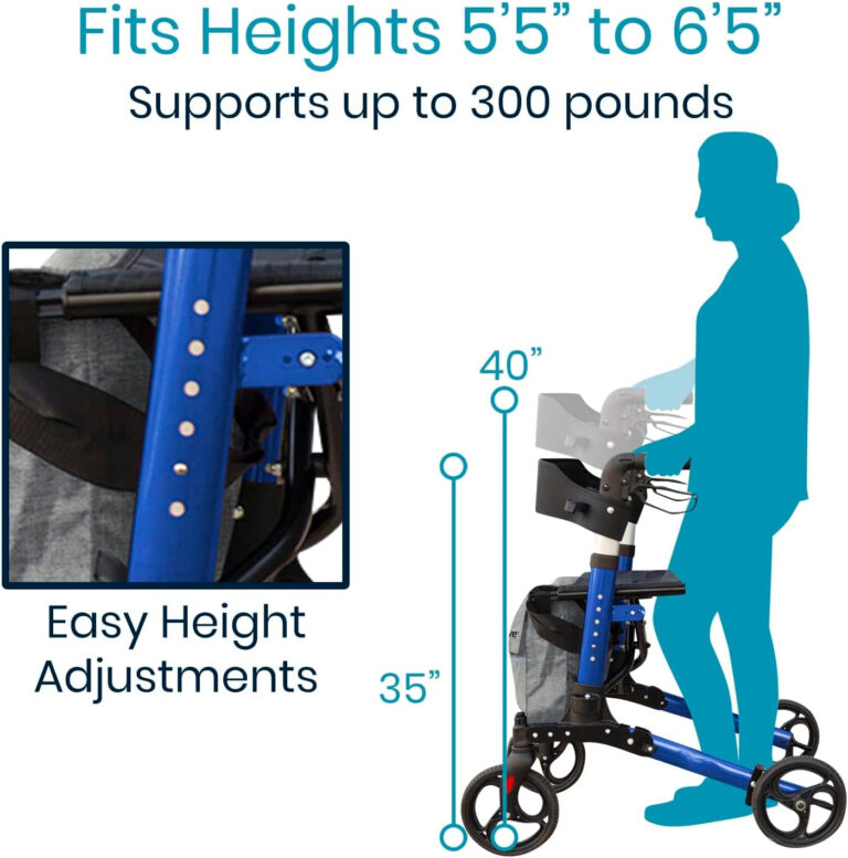 This is a great walker for most people. If I were not 6’5″ it would be great for me! It would be 5* if it were taller. I wish companies would realize tall is not over 6′ and design things for those are actually designed for Taller people. So far I have not been able to find anything Tall enough to suit my needs without breaking the bank