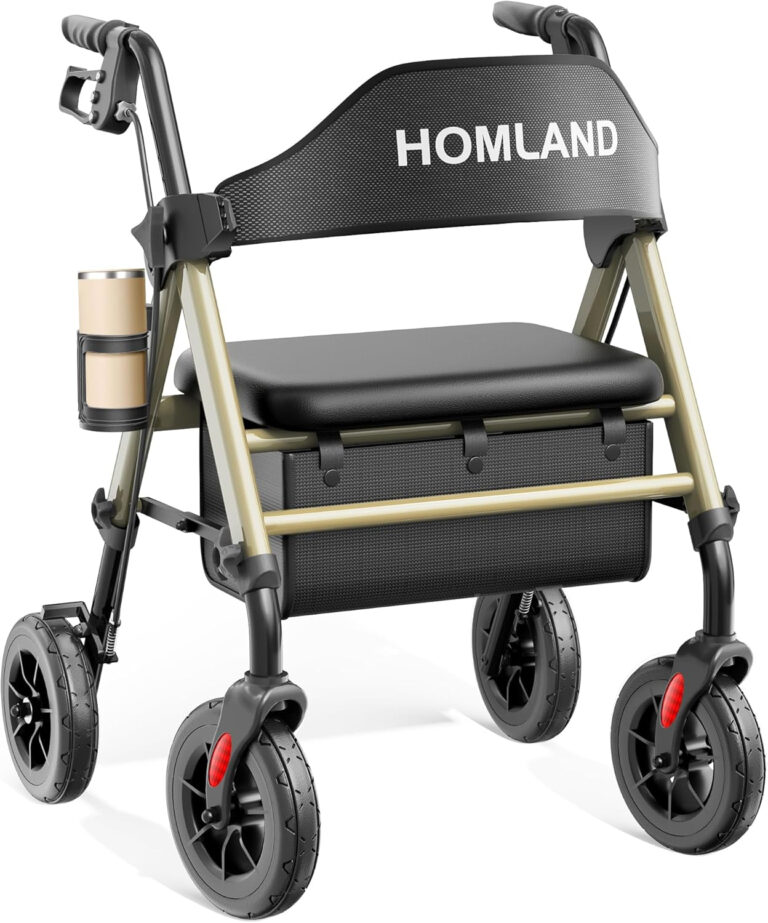 I’ve used rollators and wheelchairs and scooters and canes since 2012 and have several, so I did expect this “bit-more-expensive” rollator to perform well, but it is SO perfect, I had to share. It’s weight capacity is perfect for holding me with a grandchild in my lap – love that. And the padded vinyl seat is cushy! Comfortable on the butt! It is surprisingly QUIET – no squeeks, no rattles, no floppiness with the bag or cables – pretty great! Nothing falls out of an enclosed bag (it’s not a wire basket). The height adjustment enables fitting it into smaller trunks and backseats in probably any vehicle. Assembly instructions are clear, quick and the Homland rollator goes together Really Easily – even for fossils like me! Pieces are well-engineered and made with precision, and the few big parts are already mostly assembled. Homland doesn’t brag enough about this, but it’s a big deal that all the few pieces are well made, partly assembled, and fit together perfectly! I did have ONE issue with brakes. Both wheels arrived locked into the brake position and I found no instructions for adjusting that to make it work. Fortunately, I have a car-guy husband who went to work immediately upon seeing my little tools laid out. It took him about 20 minutes to get wheels rolling with the brakes working perfectly, but this could be an issue for others. I have used this All 5 Days since it arrived & we got it assembled. It makes getting around the house easy (granted we do have wide doors), and so much faster than using a cane, and I carry things to other rooms by sitting them on the seat frequently. We traveled with it last weekend, and it is a “little” heavier than most rollators, but I or my elderly husband got it in and out of the back hatch without difficulty. It is so efficient, putting my bags on the seat or hanging them from a handle along with my cane to roll everything into a hotel room in just one trip. I had another rollator previously that would mysteriously catch, making the rollator pause while in motion, and its rattle was annoying. So I am VERY GLAD TO HAVE this heavy duty Homland model, and I WOULD Definitely buy it again.
